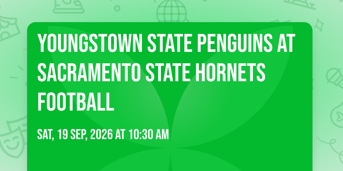 π Location: 38.5581, -121.421β¨ Experience the magic of Youngstown State Penguins at Sacramento State Hornets Football, where moments become memories that last a lifetime! ποΈ The iconic Hornet Stadium - Sacramento in Sacramento, CA sets the perfect stage for an unforgettable celebration on September 19th, 2026 at 10:30 AM. π It's been a curated experience that brings together the best of entertainment and innovation, creating an atmosphere of wonder and excitement. From the moment you arrive, you'll be immersed in a world where the ordinary transforms into the extraordinary. π Book early to secure your place in what promises to be an event that will be talked about for years to come!