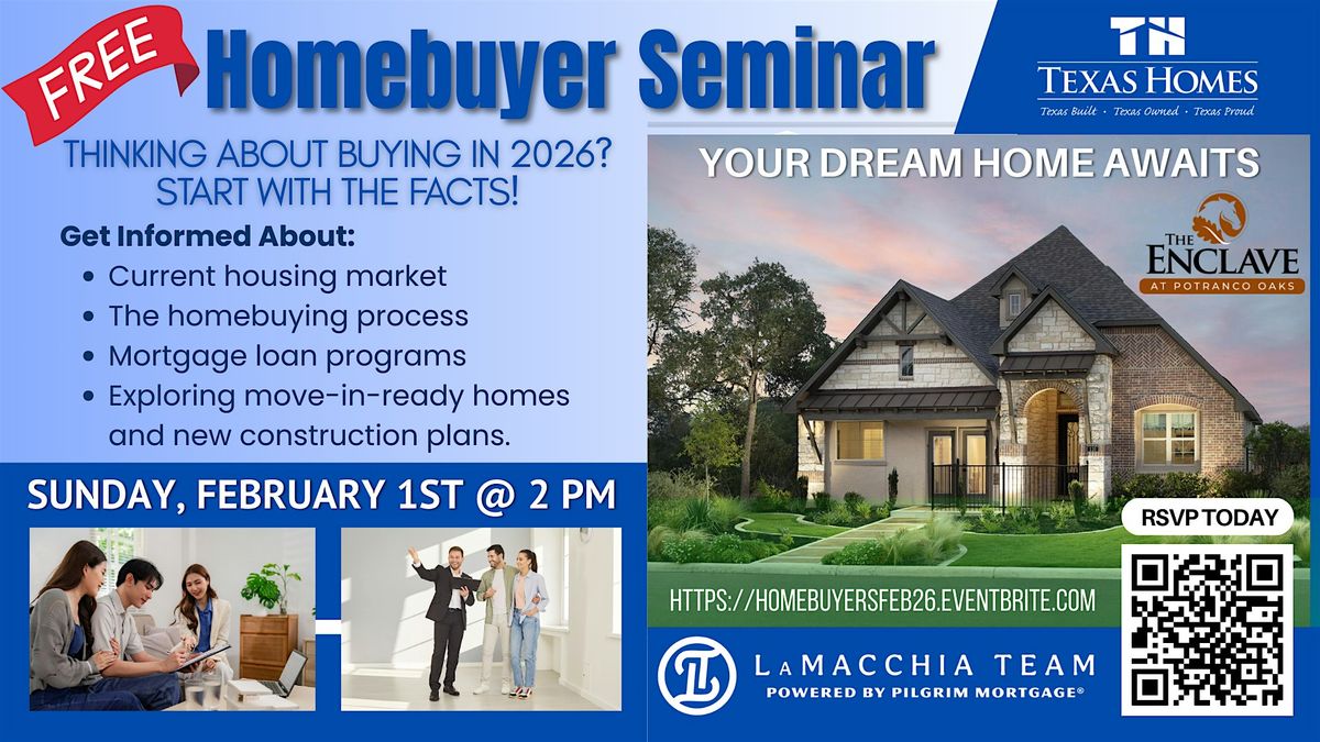 Welcome to your FREE Homebuyer Seminar! 🏡 Join us on Sunday, February 1st, from 2 pm - 3 pm (CST) at Texas Homes The Enclave at Potranco Oaks. You will learn everything you need to know about the current housing market, the homebuying process, and mortgage loan programs, all while exploring move-in-ready homes and new construction plans.
