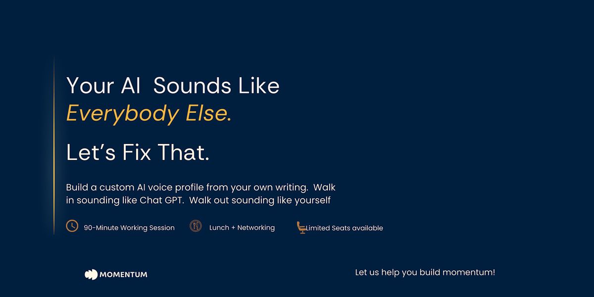 A working session. Not a lecture. You'll bring samples of your best professional writing — emails, LinkedIn posts, proposals, presentations — and leave with a custom AI voice profile that makes every piece of content you create actually sound like you.