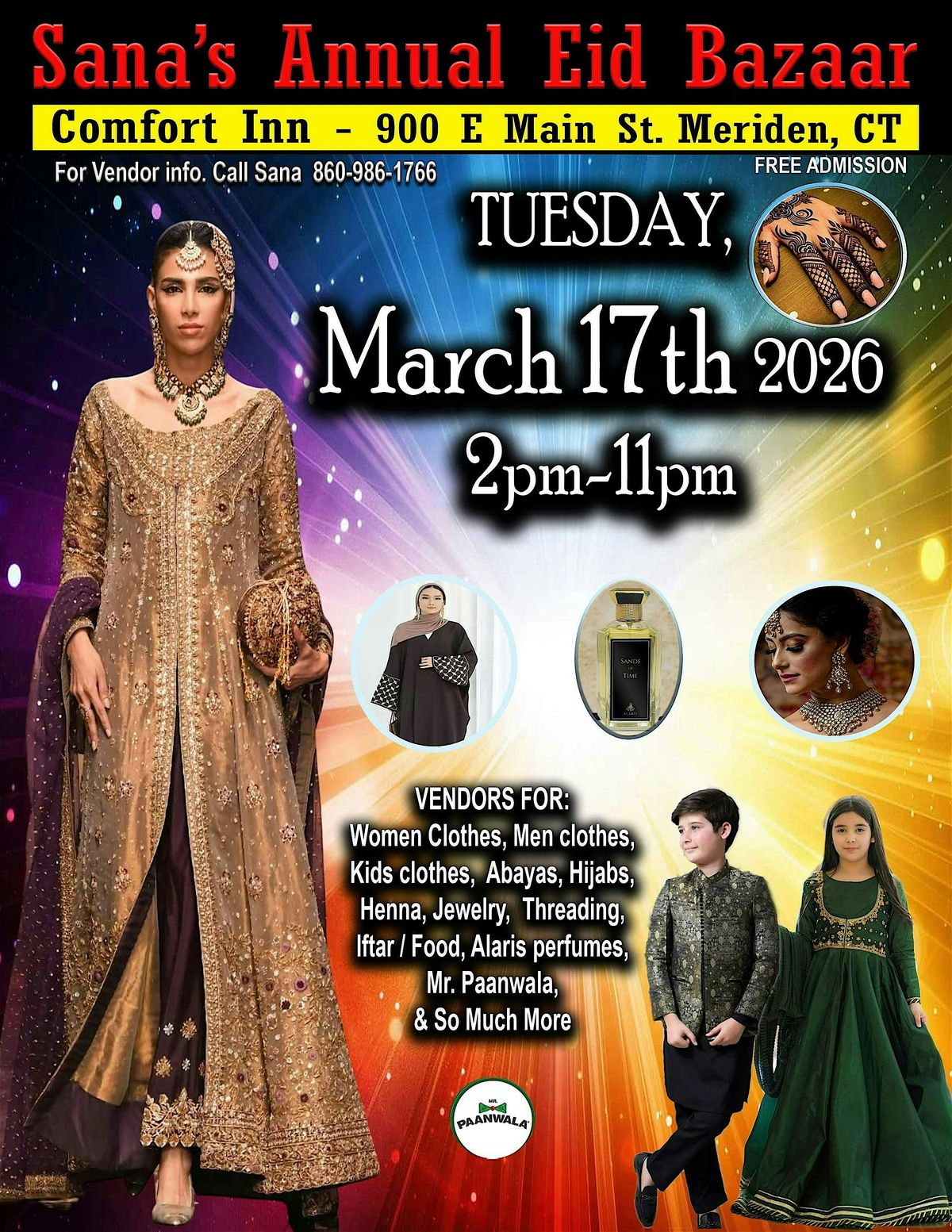Join Sana’s Annual Eid Bazaar in Meriden, CT! Shop South Asian fashion, jewelry, henna & Halal food. Tuesday, March 17, 2026, 2-11pm. Free family event!