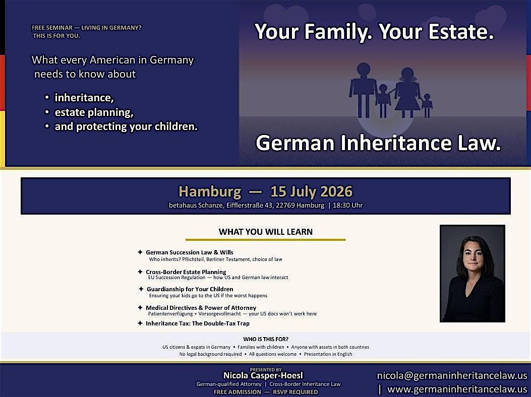 Join German-qualified attorney Nicola Casper-Hoesl for a free 60-minute seminar on German inheritance law and estate planning -- specifically designed for US citizens and expats living in Germany.