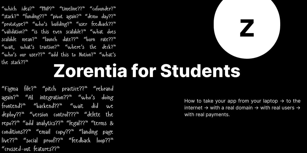 A Zorentia facilitator will help you understand what you’re trying to do, and you’ll use Zorentia to get a personalised breakdown for your exact scenario — whether it’s domains, deployment, users, or payments. This isn’t a technical lecture. It’s hands-on, practical help for your project. No coding experience needed.You’ll leave knowing: