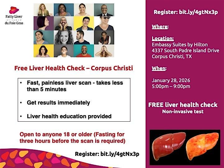 Join us for Your Liver Your Health – Corpus Christi, a free, in-person liver health screening event hosted by the Fatty Liver Alliance. Adults 18 and older are invited to receive a fast, painless, non-invasive liver scan with immediate results and a brief explanation of what those results mean. This event is designed to help individuals better understand their liver health and identify potential concerns early.