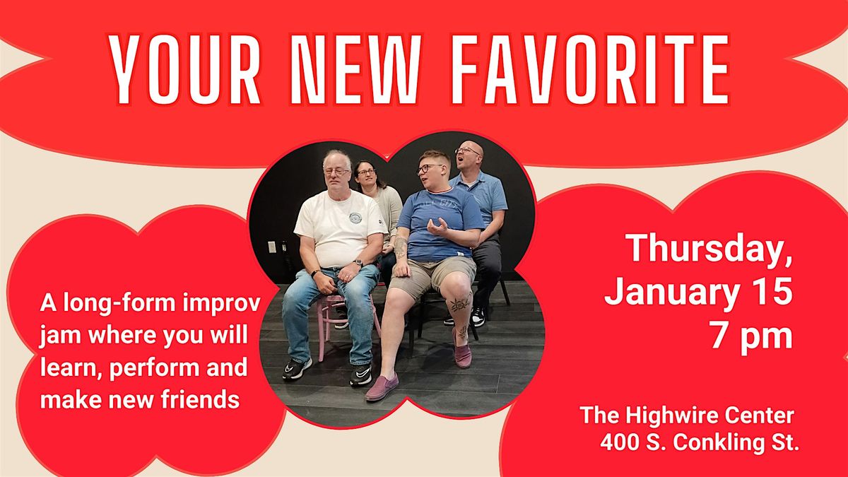 Join us for Your New Favorite, a free community-based improv jam where you'll connect with fellow improvisers, perform on stage, and make unforgettable memories! This unique event combines a social hangout with a fully staged show.