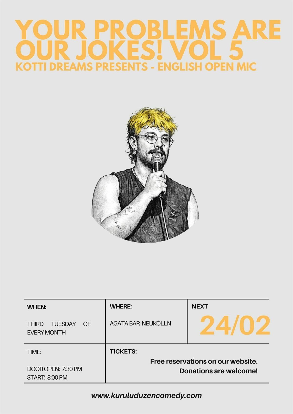At “your problems are our jokes - open mic”, comedians get 5 minutes to deliver their best material — and then 2 minutes to tackle your real-life problems in the funniest way possible.