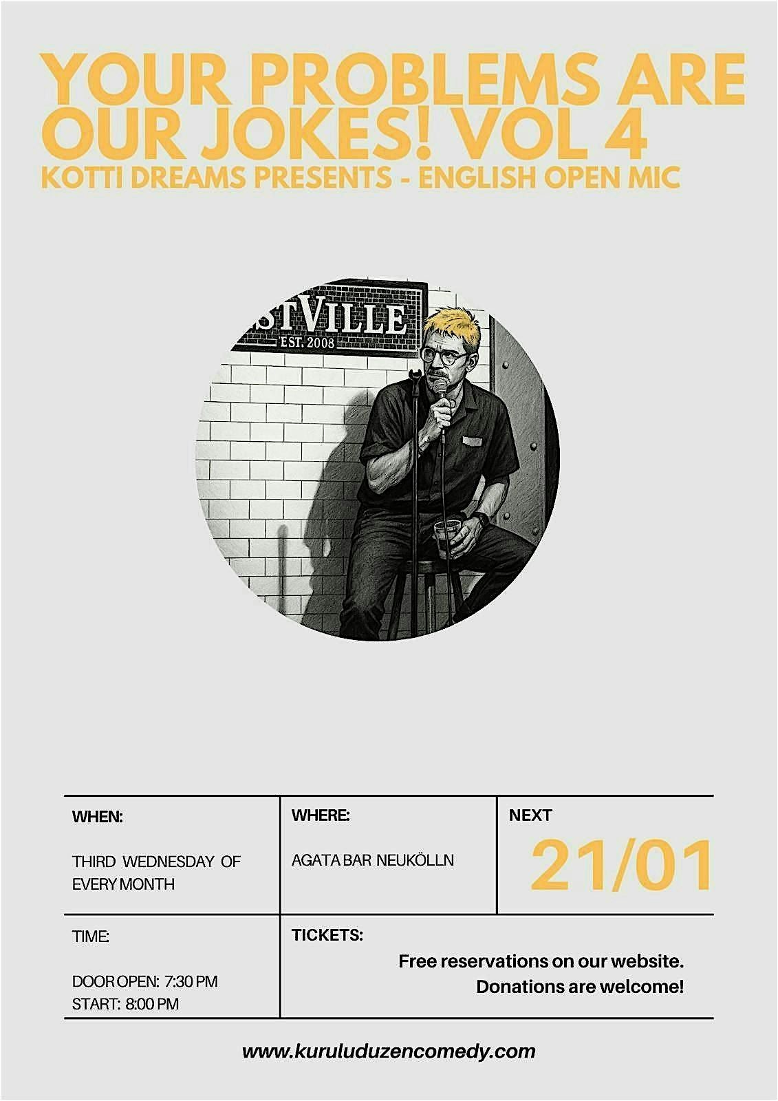 At “your problems are our jokes - open mic”, comedians get 5 minutes to deliver their best material — and then 2 minutes to tackle your real-life problems in the funniest way possible.