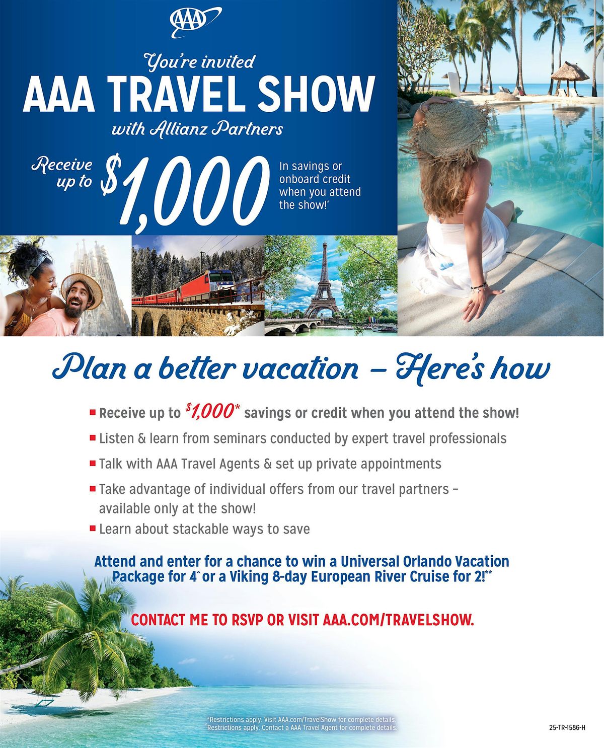 Join us for an exclusive AAA travel showcase designed to help you plan your best vacation yet. Whether you're dreaming of a river cruise, theme‑park adventure, or a guided tour across the globe, this event gives you the insider access and savings you won’t find anywhere else.