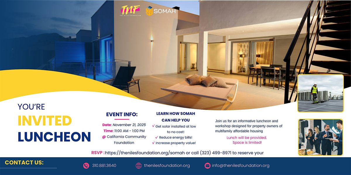 Join The Niles Foundation and SOMAH for a power-packed luncheon that’s more than just good food, it’s your ticket to turning multifamily affordable housing into high-value, low-utility-cost, community-powered assets. Property owners with 5+ units and serve disadvantaged communities in Los Angeles County this is for you.