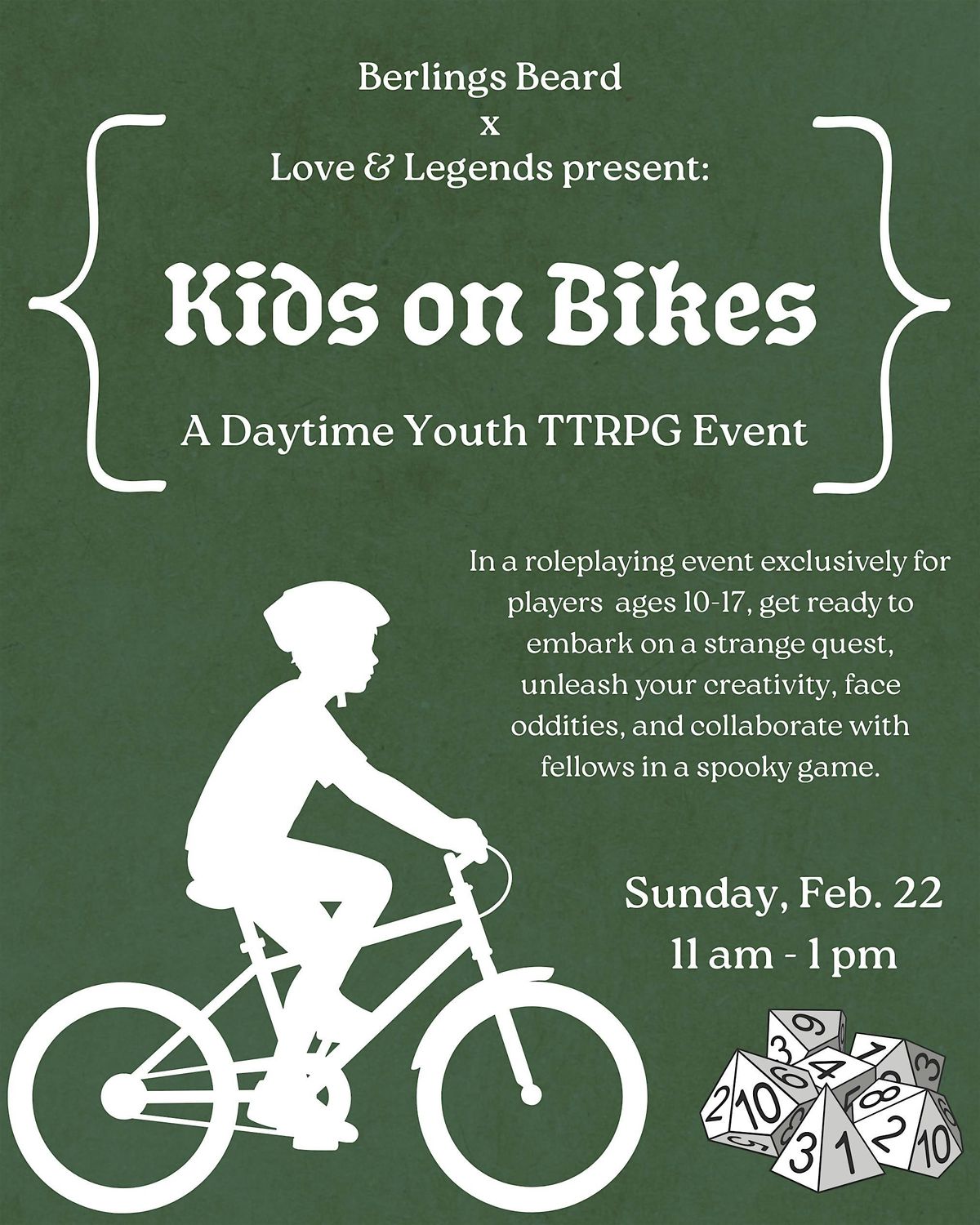 An experienced Game Master from Berlings Beard will guide you through the rules and help you create a uniquely memorable experience. We specialize in teaching the game and all materials are provided, but feel free to bring your own dice!
