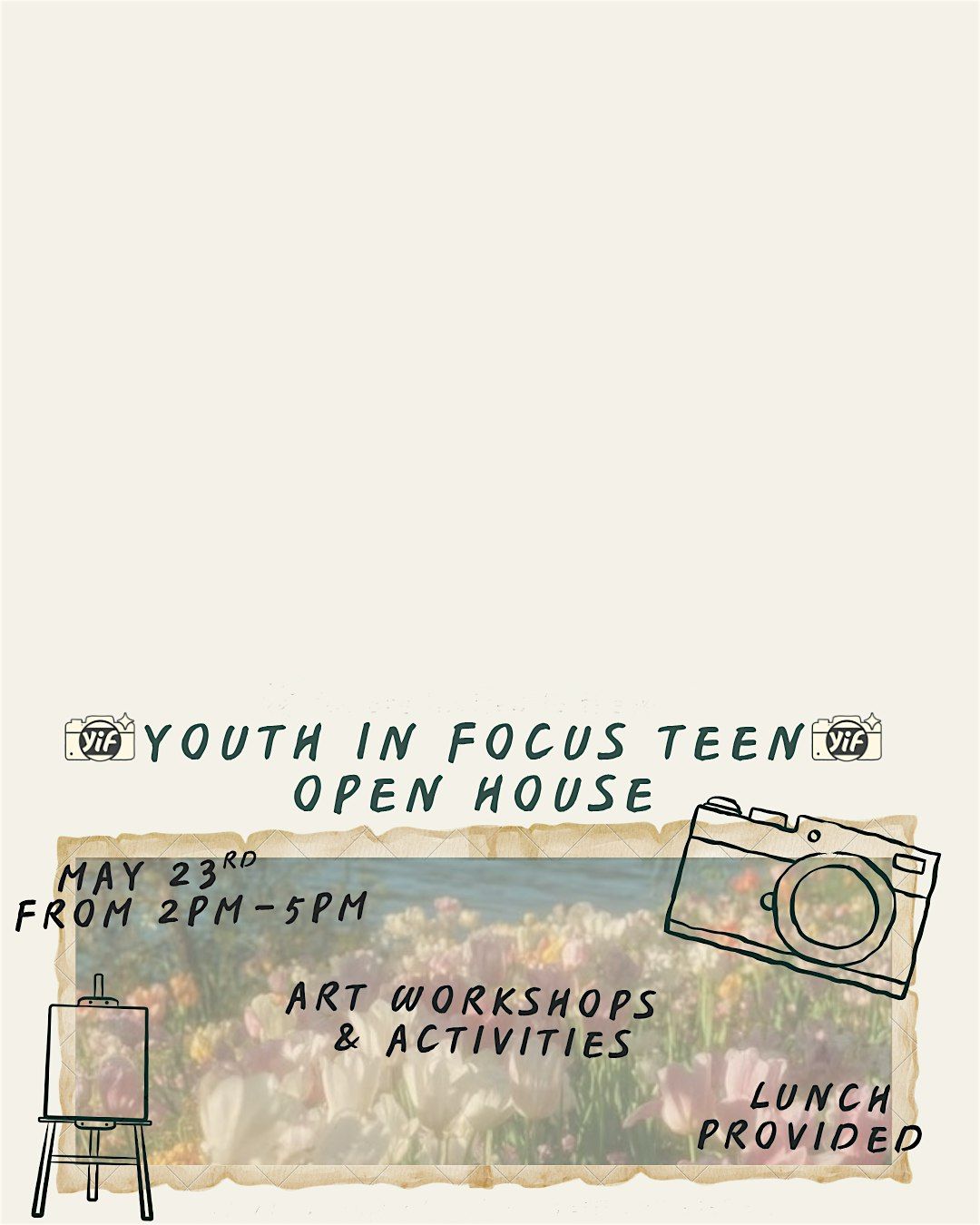A free event for teens, made by teens. Participate in the large variety of art workshops, games, and prizes. get a feel for the YiF office, meet our teachers, and discover our photography classes. Bring your friends, make new ones, and vibe out with us !