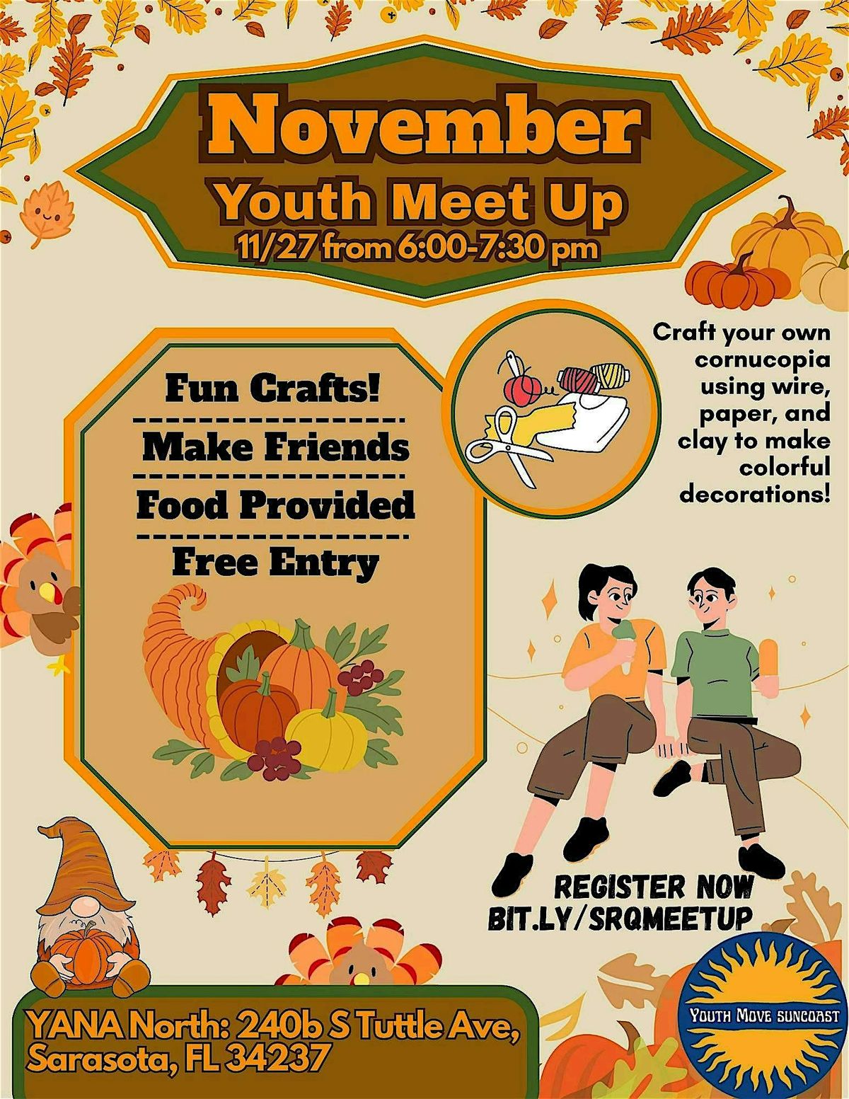 Get creative and craft your own festive cornucopia using wire, paper, and clay to design colorful fall decorations that you can take home. Enjoy free food, meet new friends, and have a great time in a welcoming space, all with free entry!