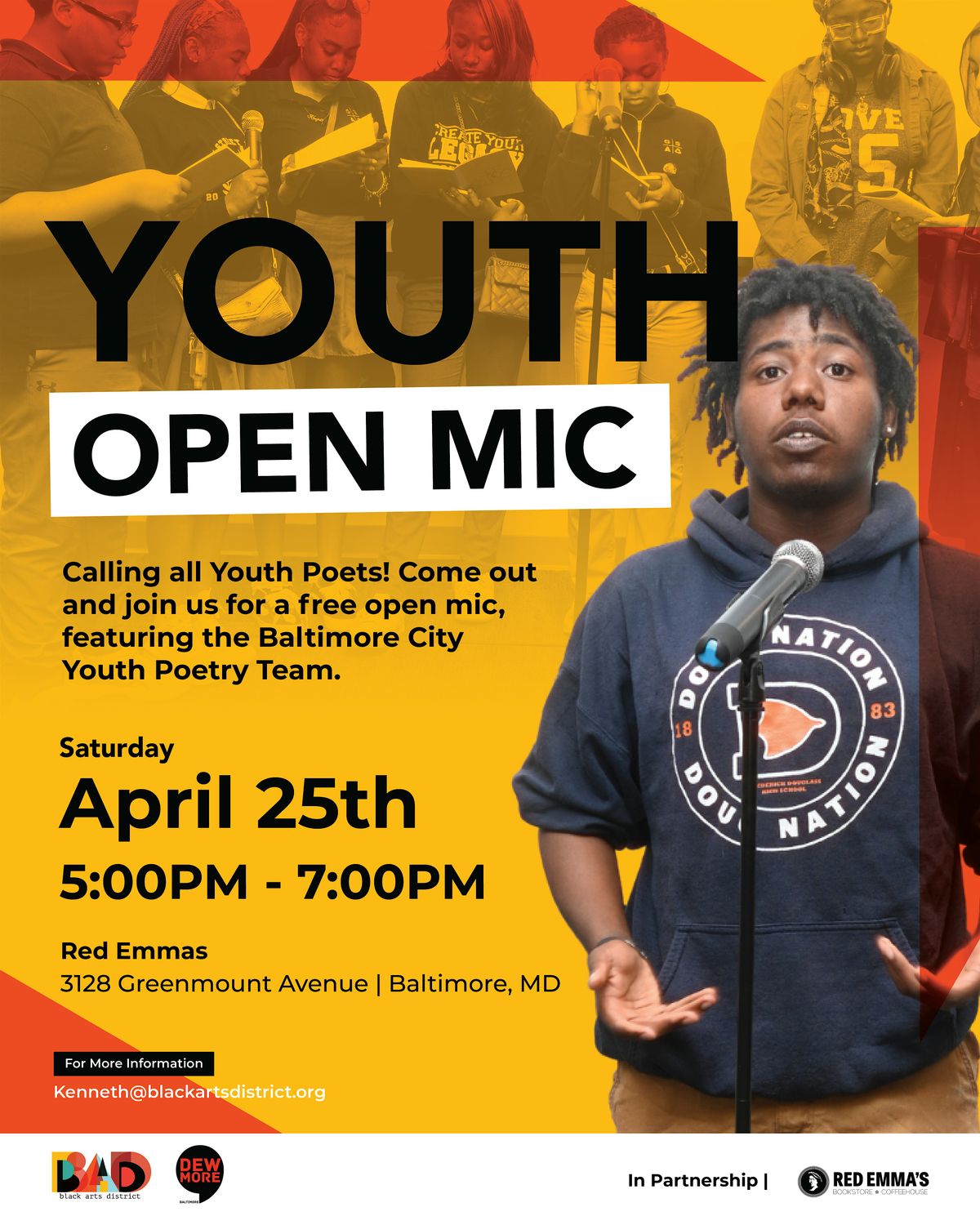 DewMore Baltimore, a youth program under the Pennsylvania Avenue Black Arts & Entertainment District, will host a free open mic to encourage young people to step out of their shells and onto the stage, to let their words be heard!