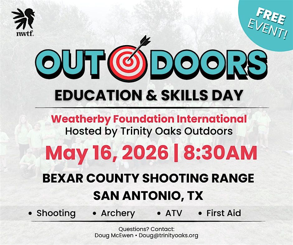 On Saturday, May 16, 2026, Trinity Oaks Outdoors and the Weatherby Foundation International will host the Youth Outdoors Education & Skills Day in San Antonio, TX.