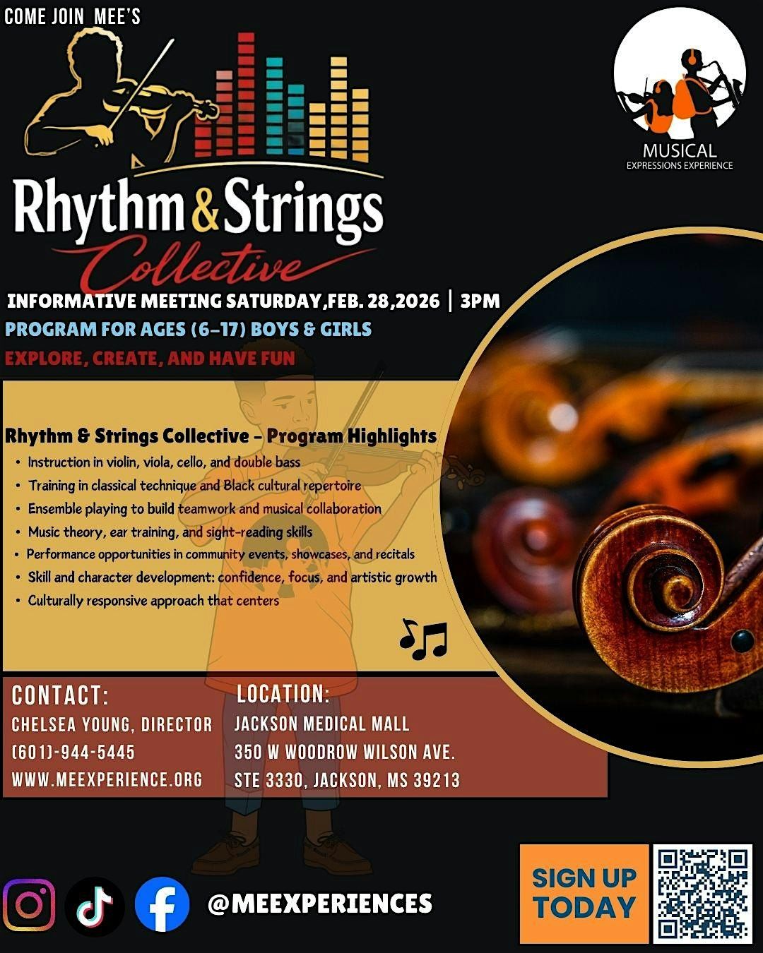 Join Musical Expressions Experience for an in-person informational meeting for the Rhythm & Strings Collective, a youth strings program celebrating Black classical musicianship and empowering K–12 students through violin, viola, cello, and bass.