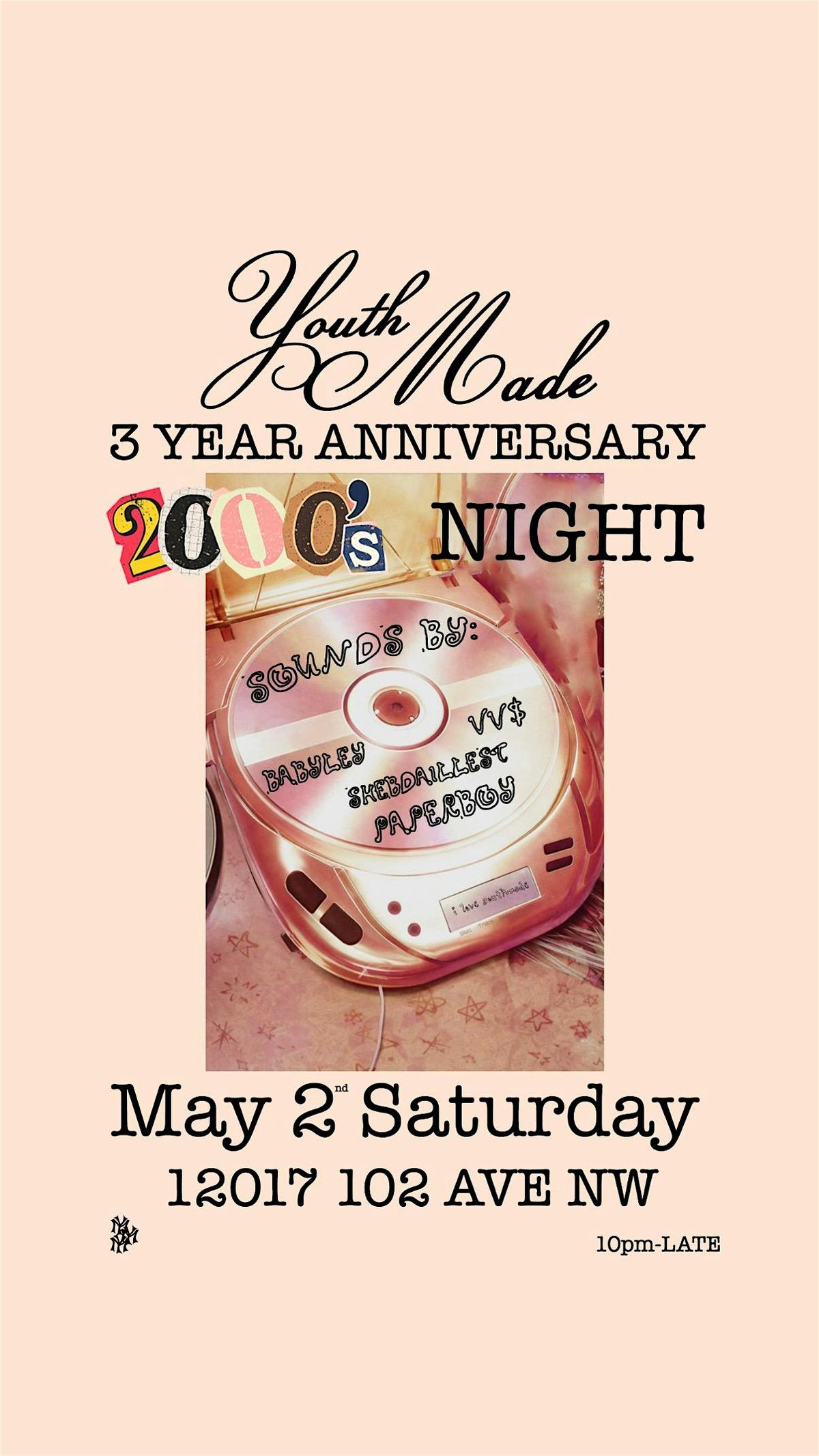 Youthmade 3-Year Anniversary 🎉 2000s Night — BRINGING BACK THE OLD SCHOOL VIBES FOR ONE NIGHT IN EDMONTON. Expect hip-hop, R&B & throwbacks all night. Dress in your best 2000s fit—baggy jerseys, y2k fits!. Sounds by Paperboy Play, VVS, Babyley & Shebdaillest. Pull up. DONT MISS OUT ADDRESS 12017 102 AVE NW EDMONTON , ALBERTA