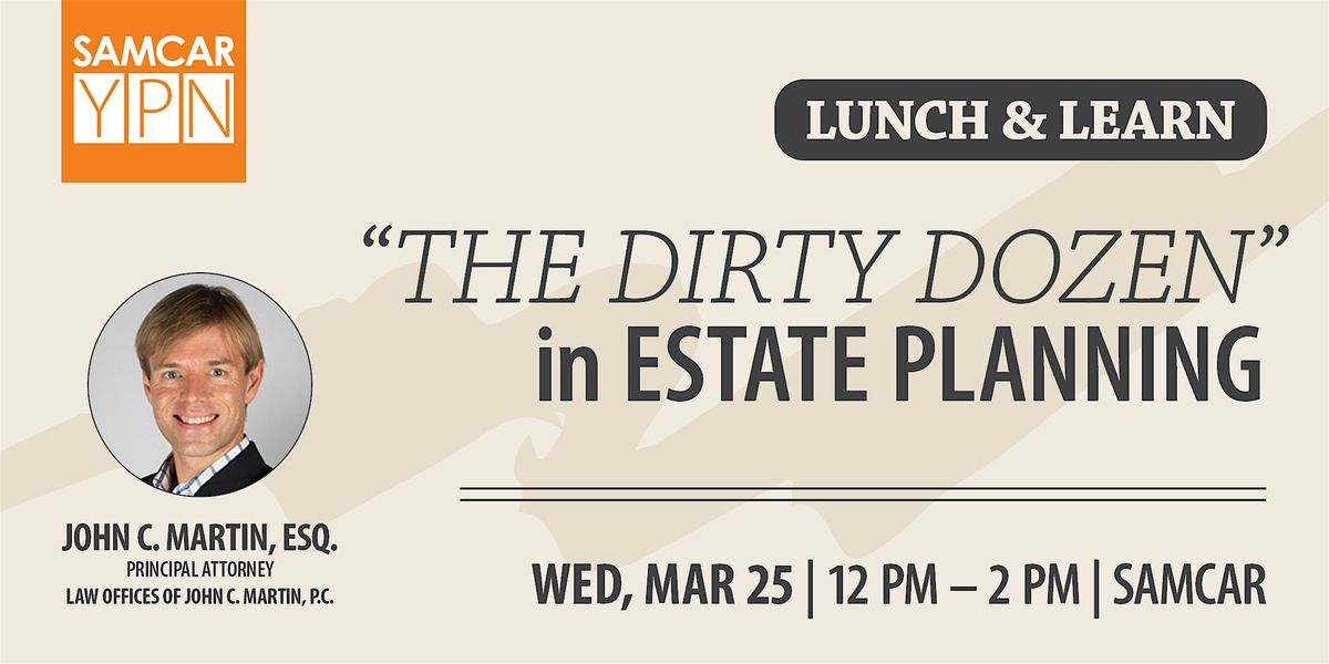 SAMCAR YPN invites you to a legal lunch and learn with attorney John Martin of the Law Offices of John C. Martin, P.C., presenting about the "The Dirty Dozen," the twelve things that can go wrong in estate planning and how to prevent them. Lunch sponsored by Fe David at Guaranteed Rate Affinity (NMLS #482592)