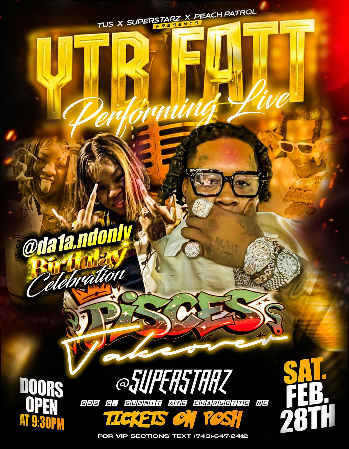 Come join us for an unforgettable night at Superstarz CLT! Get ready to groove to the beats of YTB FATT and have a blast with friends.