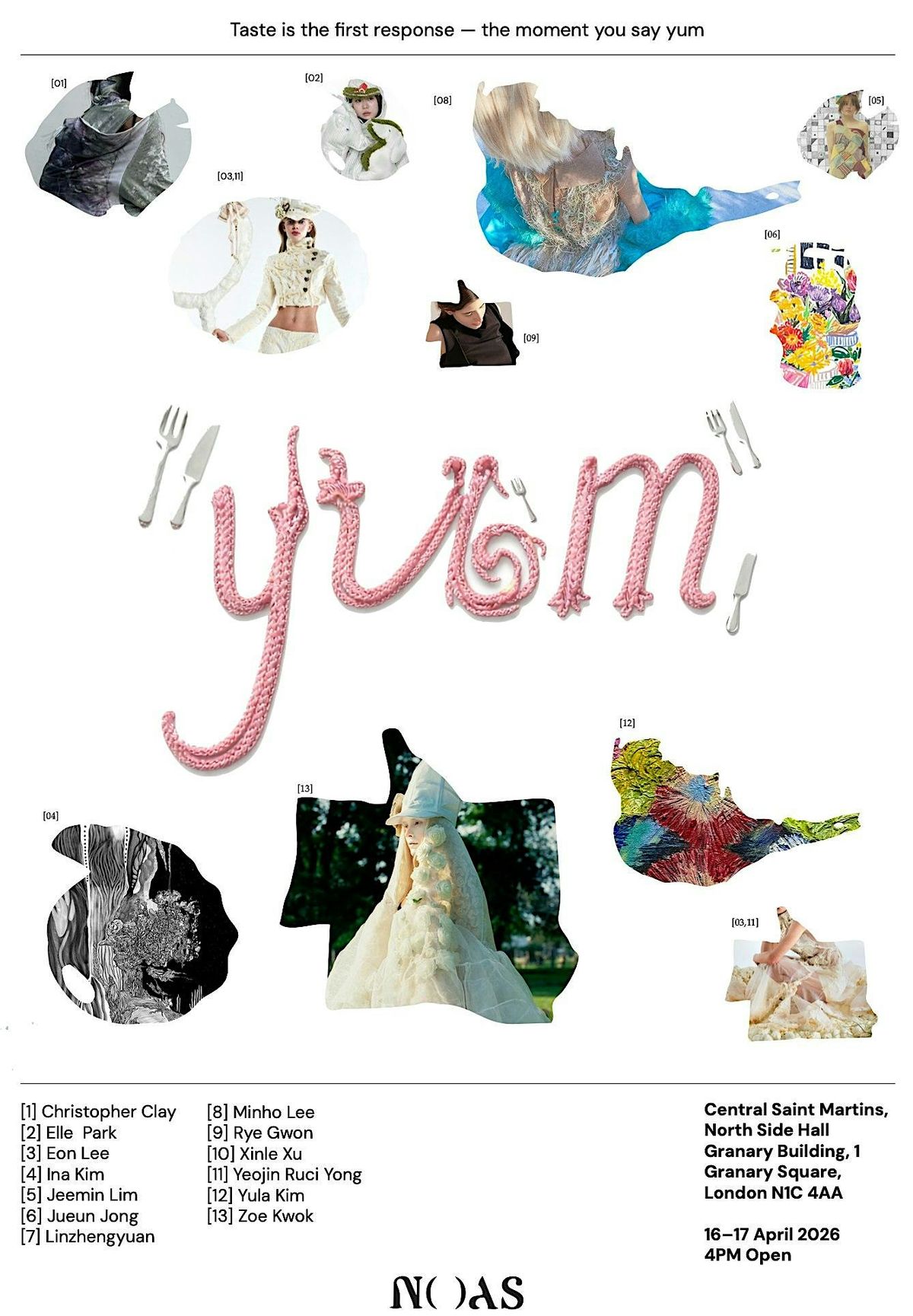 YUM! is a group exhibition at Central Saint Martins featuring 13 artists, exploring how taste is shaped by individual choice, collective presence, and the environments we live in. Across painting, illustraions, and fashion (object-based practices), each artist presents a distinct visual language, reflecting our shifting relationship to in our living enviroment. These different expressions come together in one shared environment, showing that taste is formed through how we associate ourselves with people, places, and materials. At the entrance, a multi-part cake installation introduces this idea in physical form, while a self-assembled catering setup invites visitors to select and combine elements themselves. This act of choosing begins the exhibition, revealing how personal preferences accumulate, overlap, and coexist within a living environment shaped by both urban life and nature.