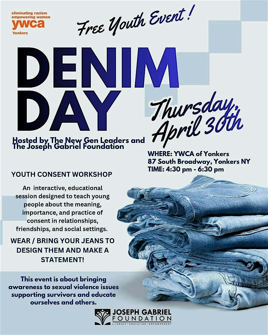 YWCA of Yonkers New Gen Leaders and The Joseph Gabriel Foundation invite you to "Denim Day" In Light of SA Awareness Month!About this Event