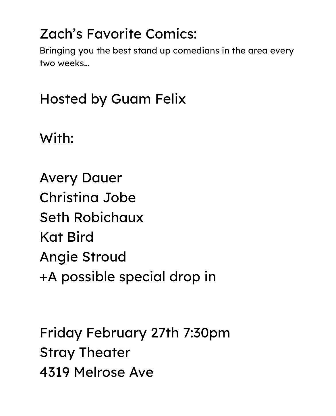 Featuring Guam Felix, Avery Dauer, Christina Jobe, Seth Robichaux, Kat Bird, Angie and possibly more!