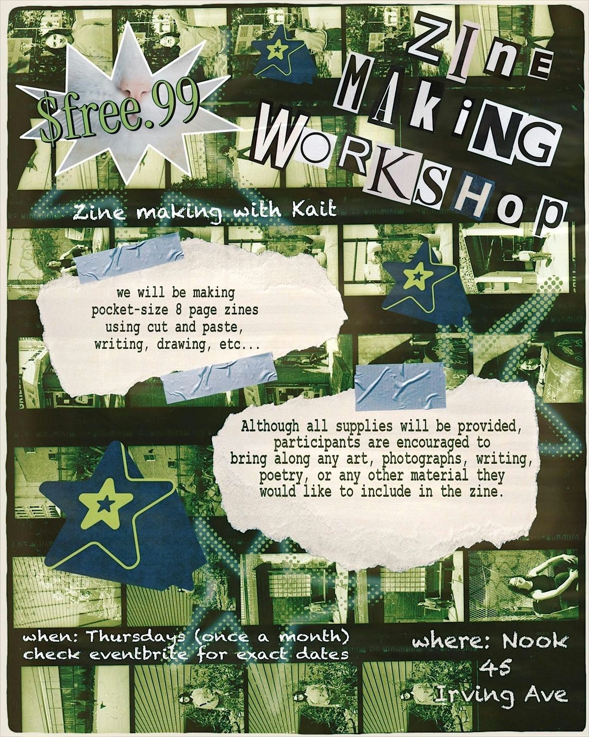 Join us for a monthly zine workshop. A zine is a small, self-published booklet that can include text, images, and other creative materials. Learn how to make an 8 page mini zine using cut and paste, writing, drawing, and stamps.