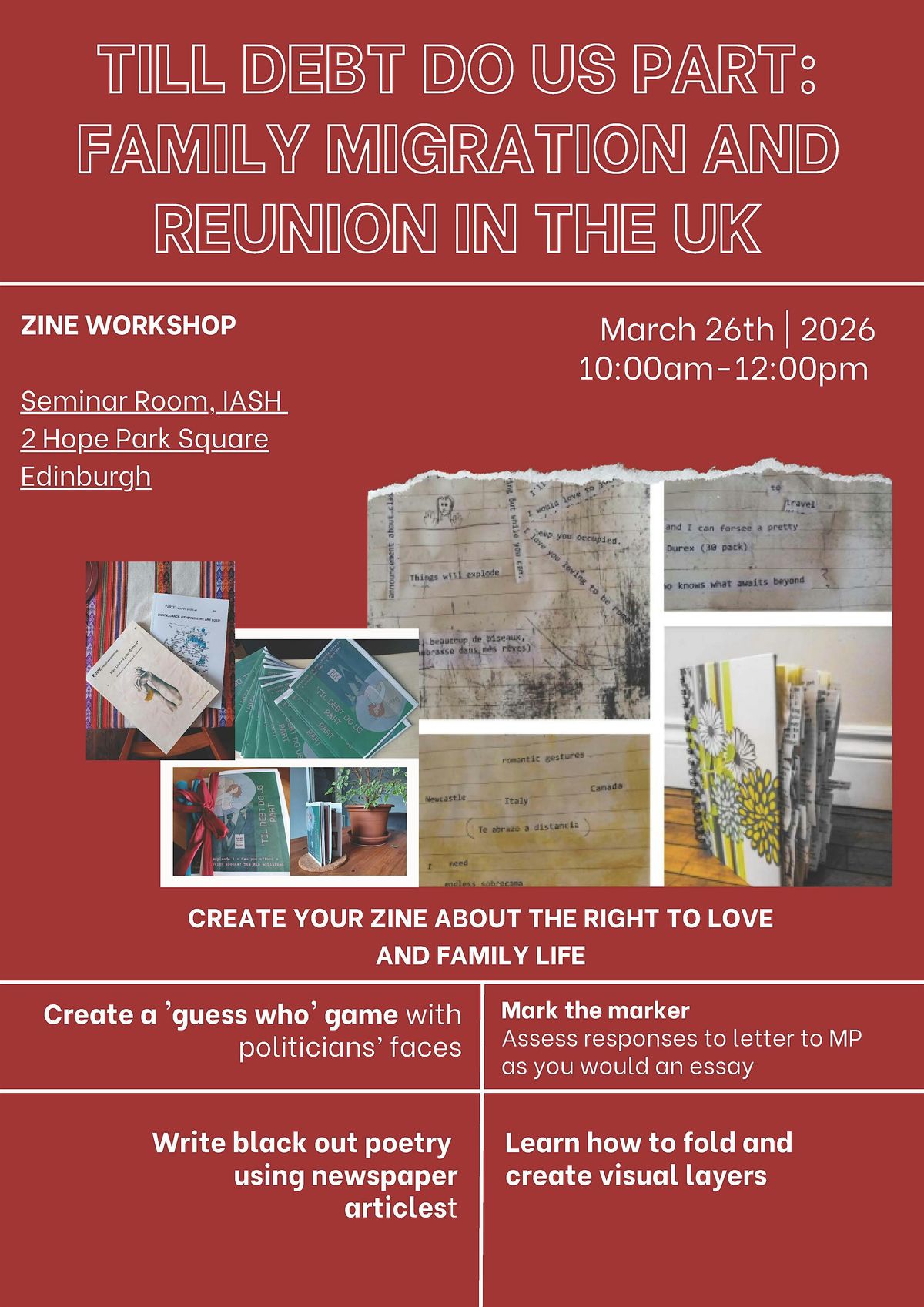 This zine workshop connected to the roundtable discussion Til Debt Do Us Part: Family Migration and Reunion in the UK (25 March 2026, 17:00-18:30 at IASH - register here) will engage participants in the creation and playful exploration of zines on the topic of family migration and reunion in the UK. Facilitated by Dr Vanessa Montesi, the workshop will show how to create different types of folds and develop zines out of different types of textual and image prompts including black-out poetry, essay marking, games. Different options for engagement will be made available, and the results will be incorporated in the final report on the postdoctoral project, sent to MSPs and freely distributed to the public.