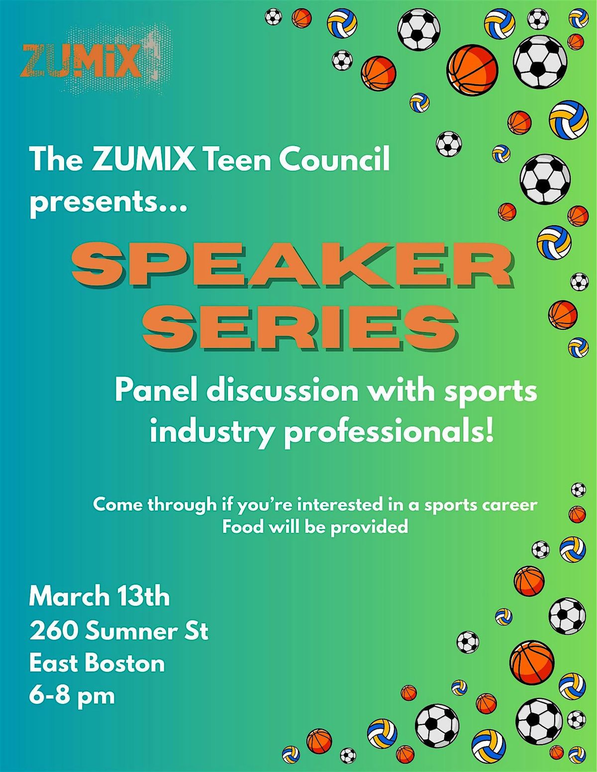 Join the ZUMIX Teen Council (ZTC) for their annual Speaker Series career panel. This is event will be focused on conversations with professionals working in the sports industry. This is a great opporunity to learn from and ask questions to folks working in this field, and to understand the potential opportunities. The panel discussion will be moderated by youth leaders at ZUMIX.
