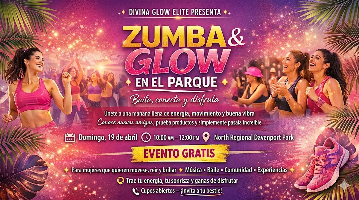 Únete a Zumba & Glow en el Parque, un evento GRATIS exclusivo para mujeres. Disfruta de una mañana llena de energía, música, nuevas amistades y sorpresas especiales.
