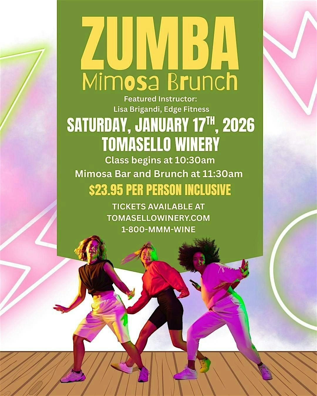 Zumba with Lisa Brigandi followed by a mimosa bar and brunch at Tomasello Winery. Zumba at 10:30 AM, brunch at 11:30 AM. $23.95 per person.About this Event