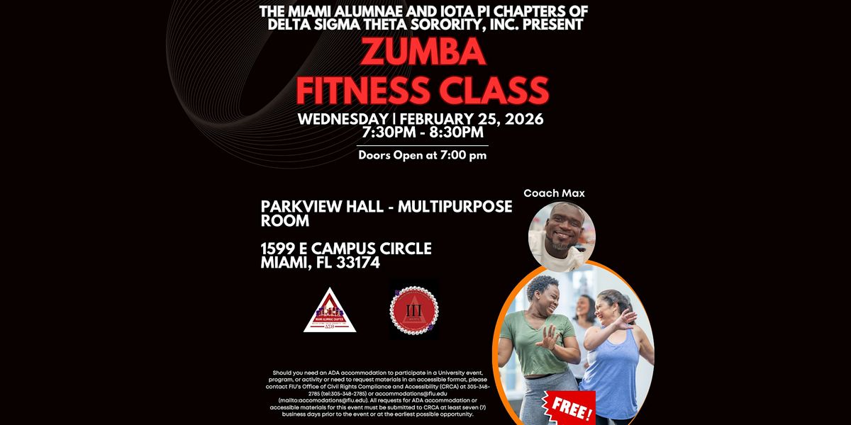 Come join us for a fun and energetic Zumba Fitness Class hosted by the Miami Alumnae and Iota Pi Chapters of Delta Sigma Theta Sorority, Inc.! Get ready to dance and sweat as we work out together at the Parkview Hall, located at FIU's South Campus. This in-person event is open to all fitness levels, so whether you're a Zumba pro or trying it for the first time, we welcome you to join us. Don't miss out on this opportunity to have a great time while getting fit!