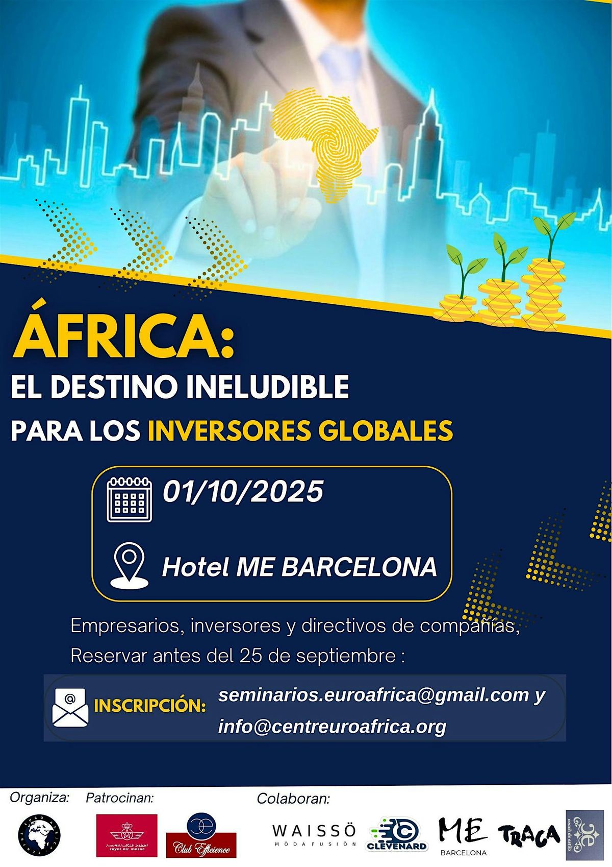 El Comité organizador del Centre Euro Africa tiene el placer de invitarle a la conferencia internacional "África: El Destino Ineludible para el Inversor Global" que se llevará a cabo el 1 de octubre a las 17:00 h en el Hotel ME Barcelona, ubicado en la C/ de Casp, 1, Esquina Passeig De Gràcia.Este evento internacional, que incluirá conferencias, constituye una valiosa oportunidad para explorar las posibilidades de inversión en África, así como para establecer contacto con personas y organizaciones que ya han invertido en la región. Está especialmente dirigido a profesionales del mundo empresarial, inversores, emprendedores y directivos de empresas. El resto de días habrá sesiones de networking, reuniones con inversores internacionales.