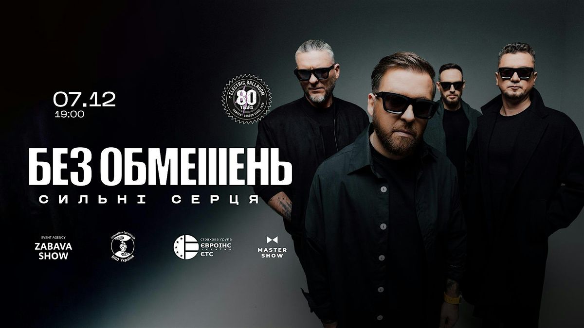 БЕЗ ОБМЕЖЕНЬ — один з найпопулярніших рок-гуртів України. Мужні, відверті рок-романтики збирають тисячні зали по всьому світу і мільйони прослуховувань на музичних платформах. Переможці найпрестижніших музичних премій: M1 Music Awards, Золота Жар-Птиця, YUNA та ін. Творчість музикантів називають яскравим прикладом української культури — сильної, самобутньої, талановитої.